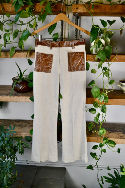Vintage Seventies Slubbed Cotton Pants. Pleather Pockets and Waist Band. Lightning Zipper With Hook & Eye Closure. Slightly Flared Leg.