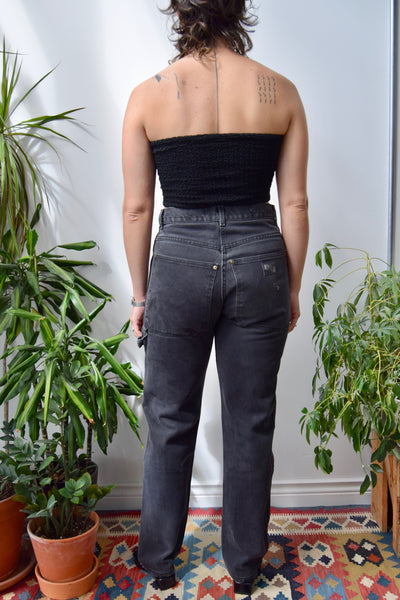 Slightly Faded Black Carpenter Jeans. Zipper Fly. Button Waist. Five Pockets. Hammer Loop. Straight Leg.