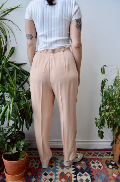 Blush Pink Silk Trousers. Side Button/Zip Closure. Pleated Waist. Two Hip Pockets. Slightly Tapered Leg. Unlined.