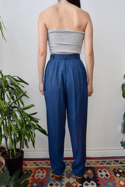 Linen Blend Trousers. Zipper Fly. Button Waist. Two Hip Pockets. Pleated Front. Tapered Leg. Unlined.