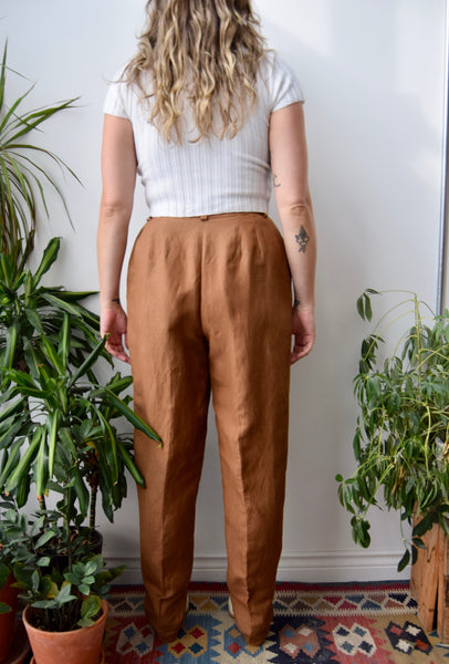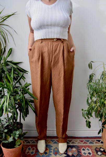 Light Brown Linen Blend Trousers. Zipper Fly. Button Waist. Two Pockets. Lined.