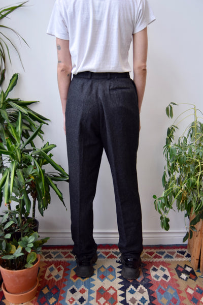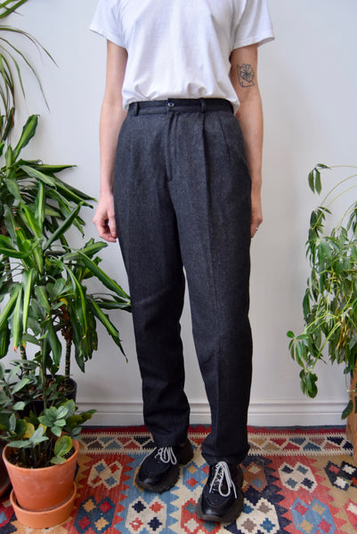 Charcoal Wool Trousers. High Pleated Waist. Zipper Fly. Tapered Leg. Lined.