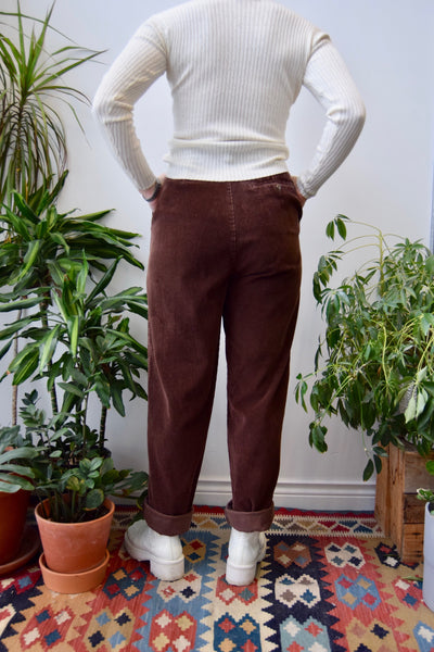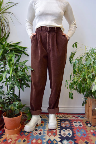 Chocolate Cord Trousers. Pleated Waist. Three Pockets. Unlined. Tapered Leg.