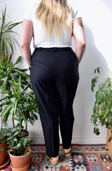 Black Wool Trousers. Pleated Waist. Elasticized Along Back. Two Hip Pockets. Tapered Leg. Lined.