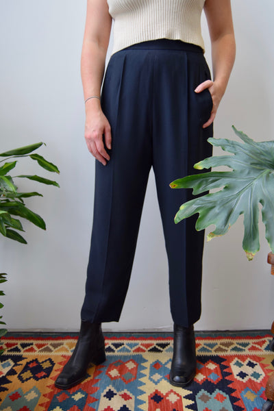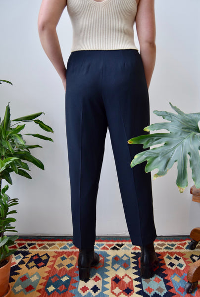 Navy Blue Trousers. Polyester Blend. High waist. Pleated Front. Tapered Leg. Side Zip Closure. Two Hip Pockets. Lined.