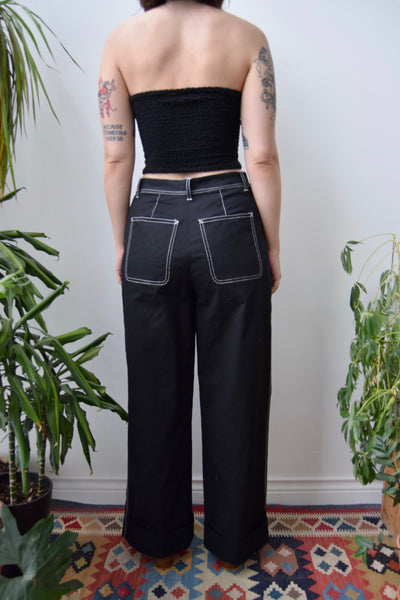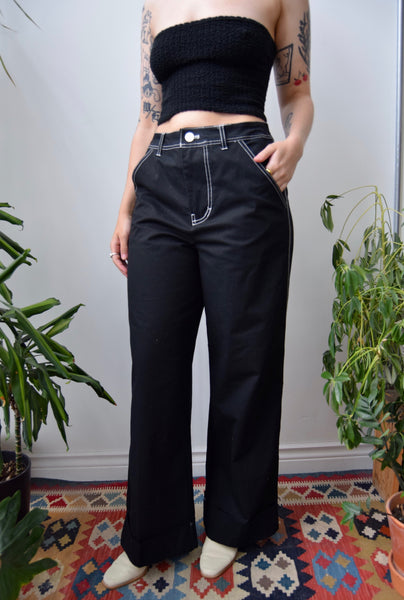 2000s Black Wide Leg Pants. White Contrast Stitching. Five Pockets. Zipper Fly. Button Waist.