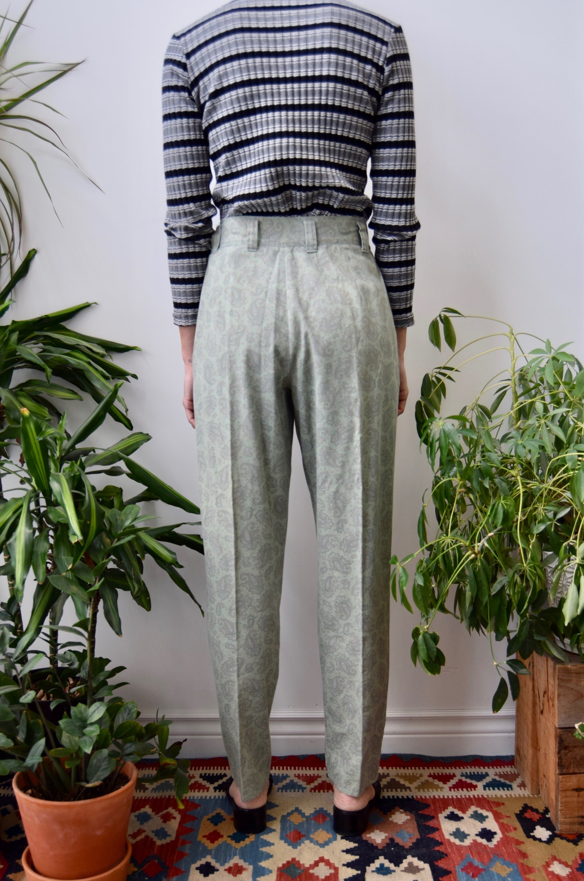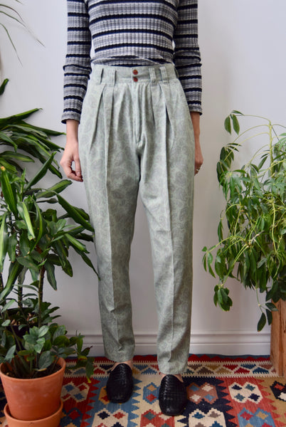 High Waist Pleated Trousers. Tapered Leg. Pleated Front. Hip Pockets. Zipper Fly And Button Waist.