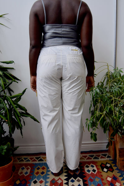 Cream Aughts Swishy-ish Pants. Side Zippers Open To Mesh Section. Four Pockets. Zipper Fly. Button Waist. Elastic Drawstring Waist. Unlined.