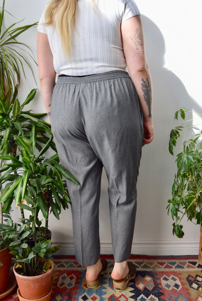 Textured Gray Everyday Trousers. Elasticized Waist Along Back. Pleated. Tapered Leg. Two Hip Pockets. Unlined.