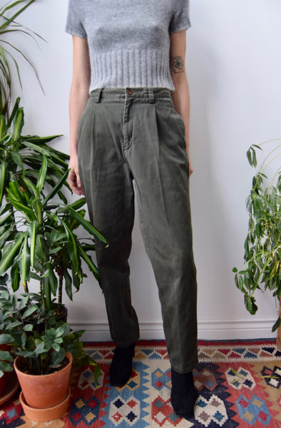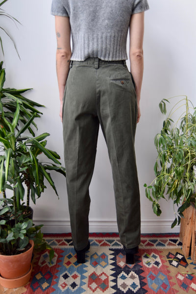 Forest Green Khaki Trousers. Zipper Fly. Button Waist. Three Pockets. Unlined.