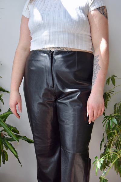 00's Black Pleather Pants. Zipper Fly. Darted Waist. Lil Flare Leg. Lined.