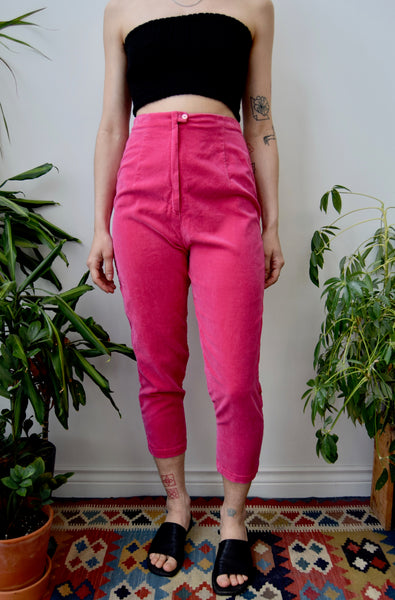 Vintage 1960s Hot Pink Velvet Pants. High Waist. Zipper Fly. Button Waist. Slim Tapered Leg. Unlined.