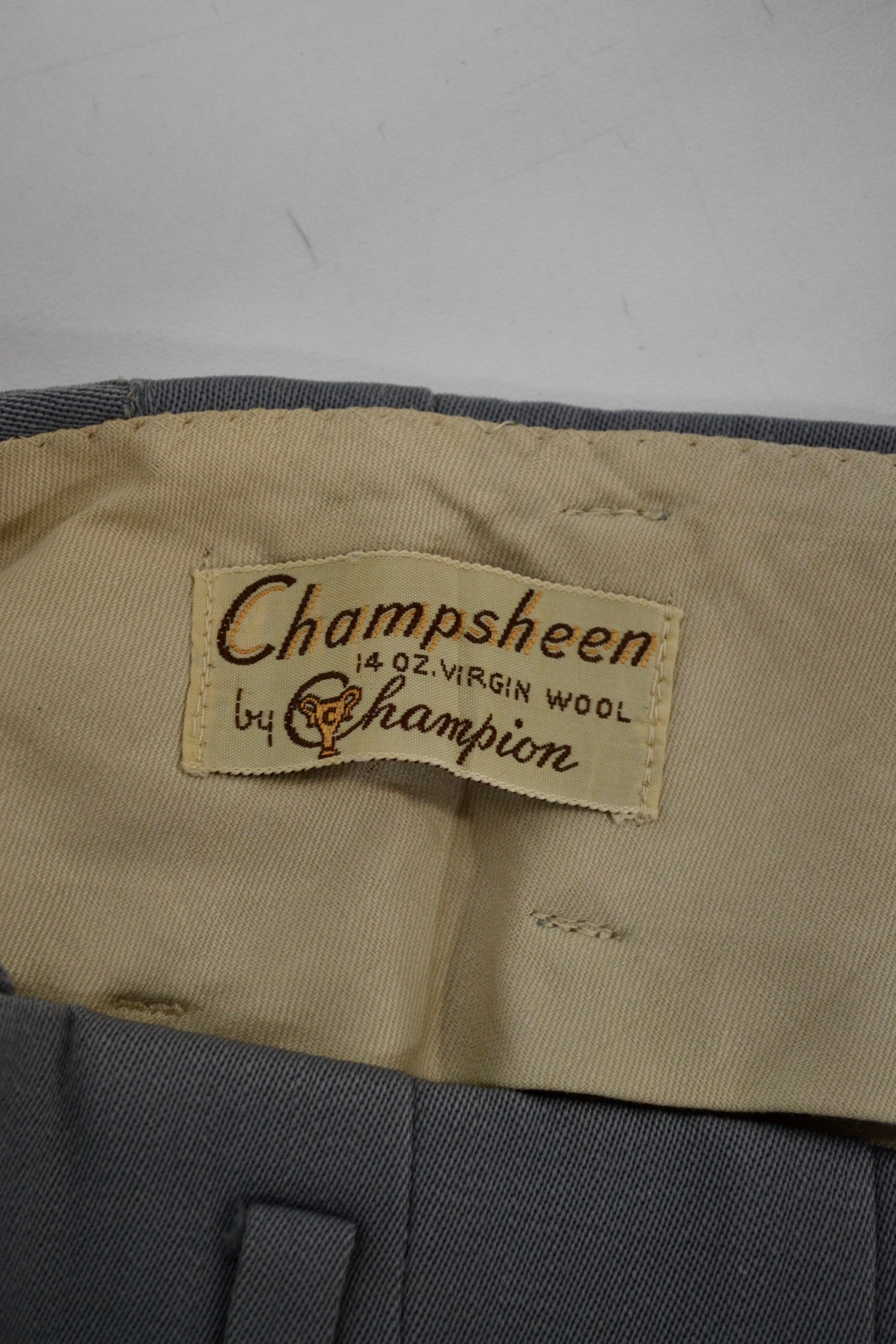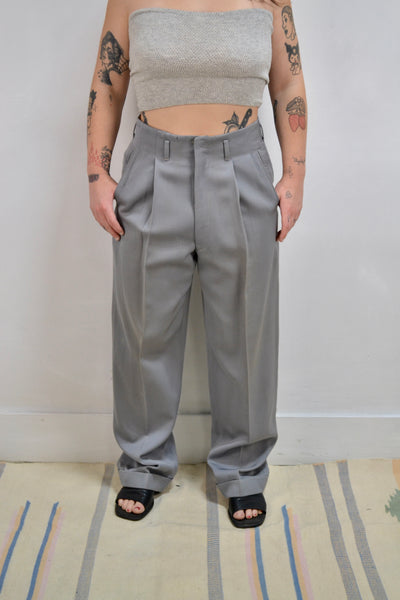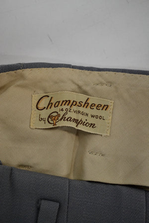 Vintage Super Cool Late 40's/Early 50's "Champsheen by Champion" Slate Grey Pleated Trousers. Four Pockets. Unlined. Talon Zipper With Hidden Button Closure at Waist.