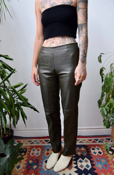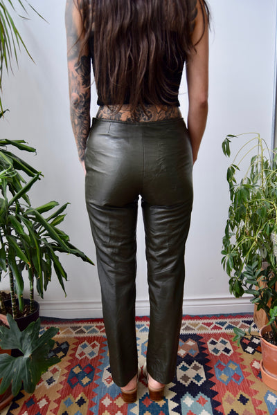 Deep Green Olive Cigarette Pants. Low Rise. Tapered Leg. Butter Soft Leather. Lined. Side Zip Closure.