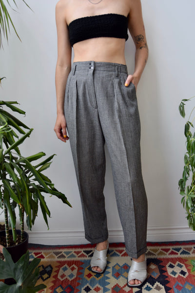 Black and White Grid Pattern Trousers. High Pleated Waist. Zipper Fly. Slightly Tapered Leg. Three Pockets. Unlined.