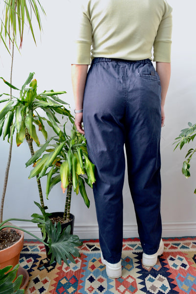 Navy Blue Cotton North Face Pants. Zipper Fly. Elastic Belt Waist. Three Pockets. Loose Tapered Leg. Unlined.