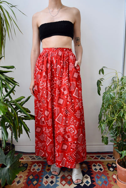 Home Made Seventies Wide Leg Red Bandana Print Pants. Zipper Closure Up Back. Hook And Eye Waist. Two Hip Pockets. Unlined.