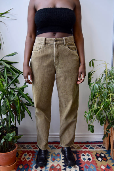 Olive Green Straight Leg Corduroy Pants. Zipper Fly. Button Waist. Five Pockets.