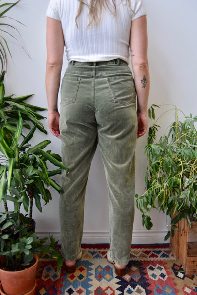 Olive Cotton Velvet Pants. High Waist. Zipper Fly. Four Pockets. Elasticized Waist Along Back. Tapered Leg. Unlined.
