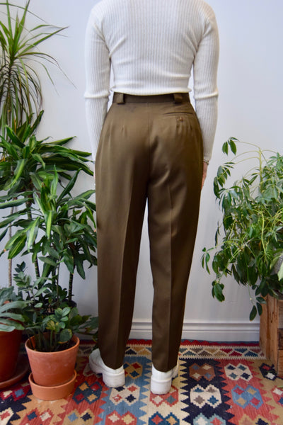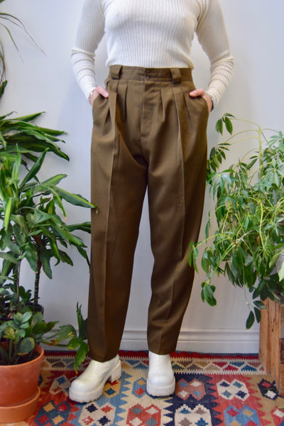 Brown Pleated Wool Trousers. High Waist. Zipper Fly. Three Pockets. Lined. Tapered Leg.