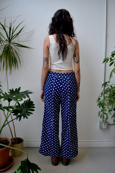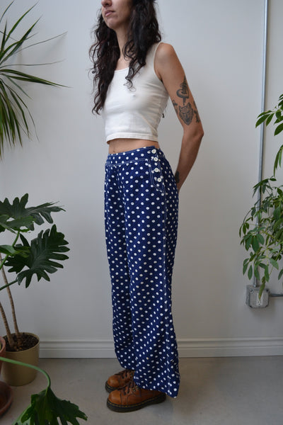 Sixties/Seventies "Mark Hoberinc" Navy Blue Polkadot Seer Sucker Sailor Pants. Button Closure on Both Sides. Wide Leg. Unlined.