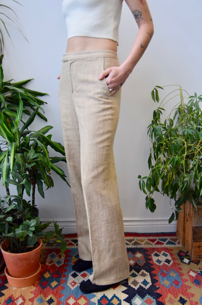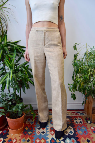 "Ralph Lauren" Beige Linen And Silk Wide Leg Trousers. Zipper Fly. Hook And Eye Waist. Three Pockets. Lined.