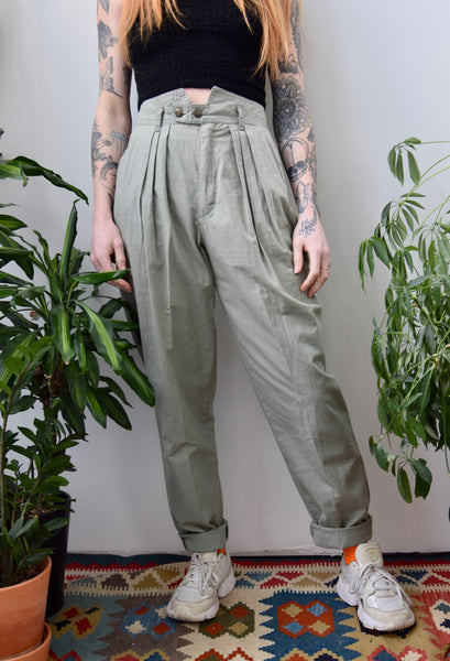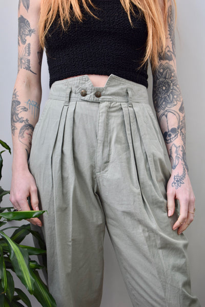 Cotton High Waist Pleated Trousers. Two Hip Pockets. High Cut Waist Yoke. Slimmer Leg.