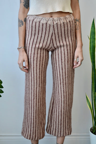 Seventies "Carol Horn Knits" Tan & Brown Striped Knit Pants. Elastic Waist. Unlined.