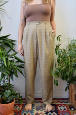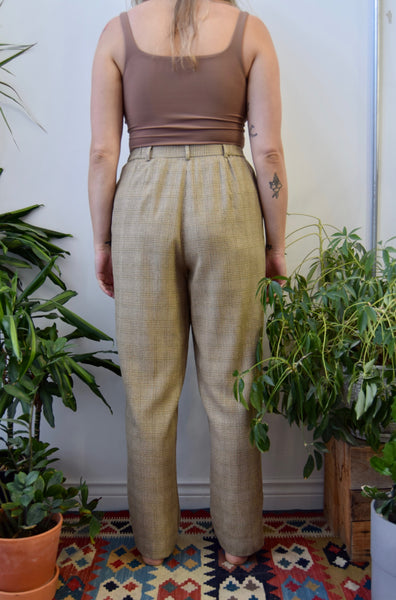 Beige Silk Blend Houndstooth Straight Leg Trousers. Two Hip Pockets. Zipper Fly. Button Waist. Partial Elastic Waist Band. Lined.