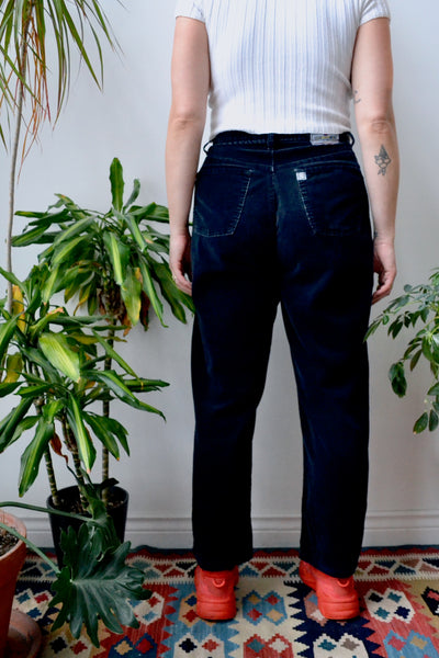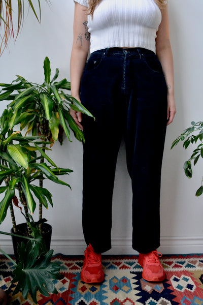 Late 90s Silver Jeans Black Corduroy Pants. Hidden Button Fly. Five Pockets. Loose Straight Legs. Unlined.