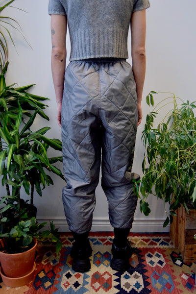 Grey Quilted Pants. Elasticized Waist. Snap Fly. Tapered Cuffed Leg.