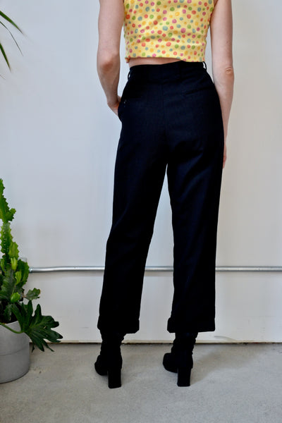Vintage 50s/60s Trousers. The Faintest Brown Stripes (appear flat black, but the stripes are there!). Four Pockets. Pleated Front. Metal Zipper Fly. Hook and Eye and Button Waist. Cuffed Hem. Unlined.