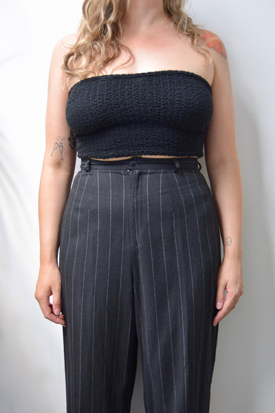 High Waist Flat Front Striped Wool Pants. Single Back Pocket. Cuffed Hem. Zipper Fly And Button Waist.