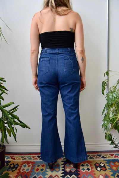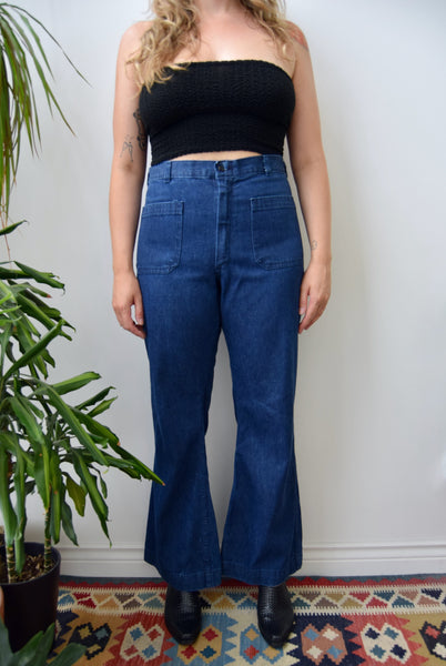 USN Denim Sailor Pants. High Waist. Zipper Fly. Four Patch Pockets. Flared Legs.
