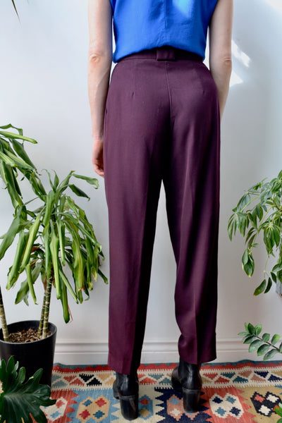 Eighties Purple Pleated Trousers. Zipper Fly. Button Waist. Pleated Front. Two Pockets. Unlined.