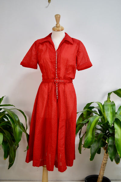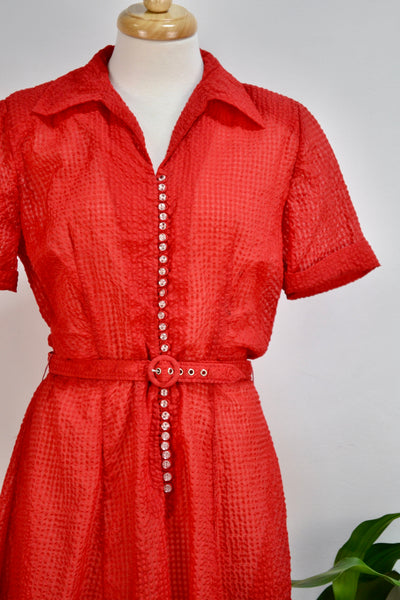 Vintage 40s/50s Red Seersucker Dress. Semi-Sheer. Plastic Jewel Button Closure in Front. Unlined. Matching Belt. Shoulder Pads.