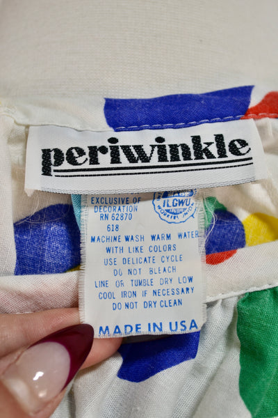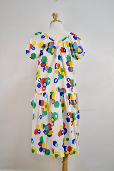 Vintage Eighties White Abstract Polkadot House Dress. Puff Sleeves With Elastic Cuffs. V Neck. Two Front Pockets (stitch in middle so they don't fall open) Unlined. Drop Waist.