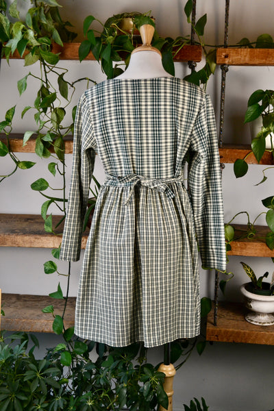 Vintage Nineties Green Plaid Long Sleeve Babydoll Dress. Two Pockets. Unlined. Button Closure in Front. Tie Back Waist.
