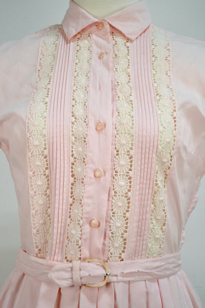 Vintage Fifties Light Pink Cotton Day Dress. Chest Darts. Short Sleeve. Button Closure in Front, With Pintuck Pleats and Crochet Lace Details. Pleated Skirt. Metal Side Zip Closure. Unlined.