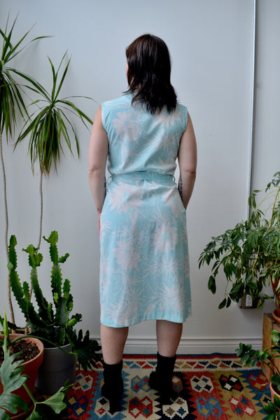 Nineties Tropical Floral Print Summer Dress. Button Closure Up Front. Sash Belt. Two Hip Pockets. Unlined.