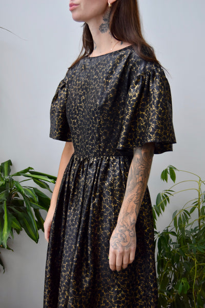 Fifties Black And Gold Tulip Print Party Dress. Flutter Sleeves. Metal Zipper Up Back At Waist. Cummerbund Style Sash.
