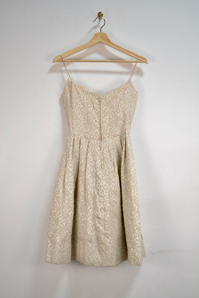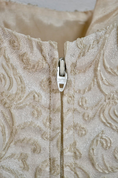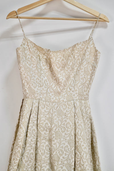 Vintage Champagne Filigree Patterned Party Dress. Pleated Skirt. Unlined. Zipper Closure in Back.