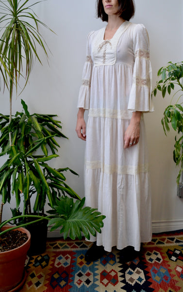 Seventies Renaissance Style Gauzy Dress. Zipper Closure Up Back. Empire Waist. Bell Sleeves. Lace Up Bodice Detail. Tie Sash. Unlined.