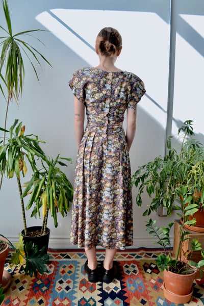 Eighties "All That Jazz" Floral Dress. Button Closure Up Back. Shoulder Pads. Two Pockets. Unlined.