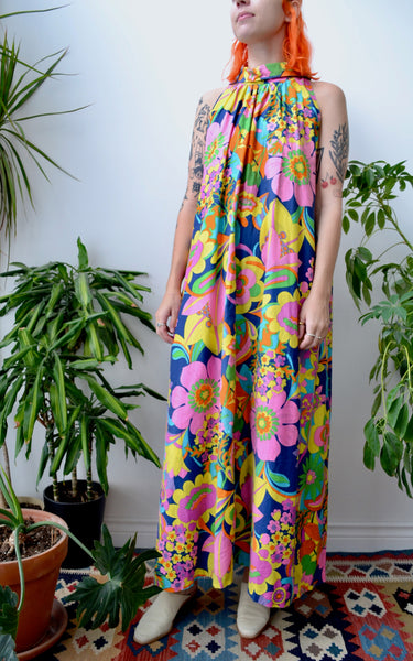 Late 60's Floral Maxi Dress. Halter Turtleneck Collar. Zipper Closure Up Back. One Hip Pocket. Unlined.