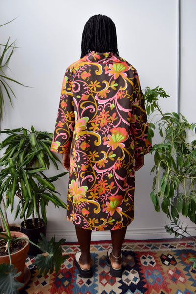 Psychedelic Floral House Dress. Snaps Closure Up Front. Bell Sleeves. Peter Pan Collar. Pink Piping Trim. Unlined.