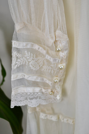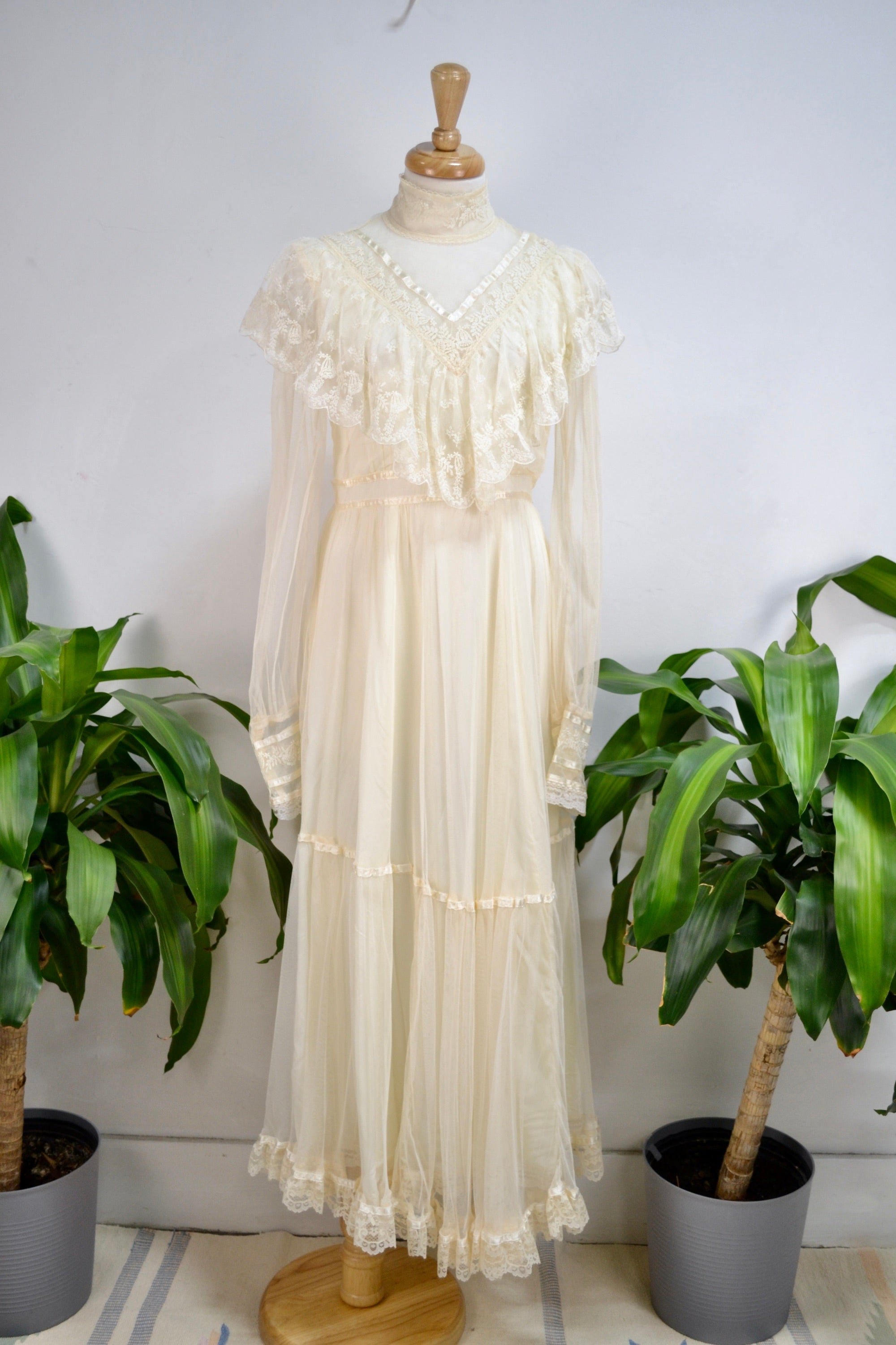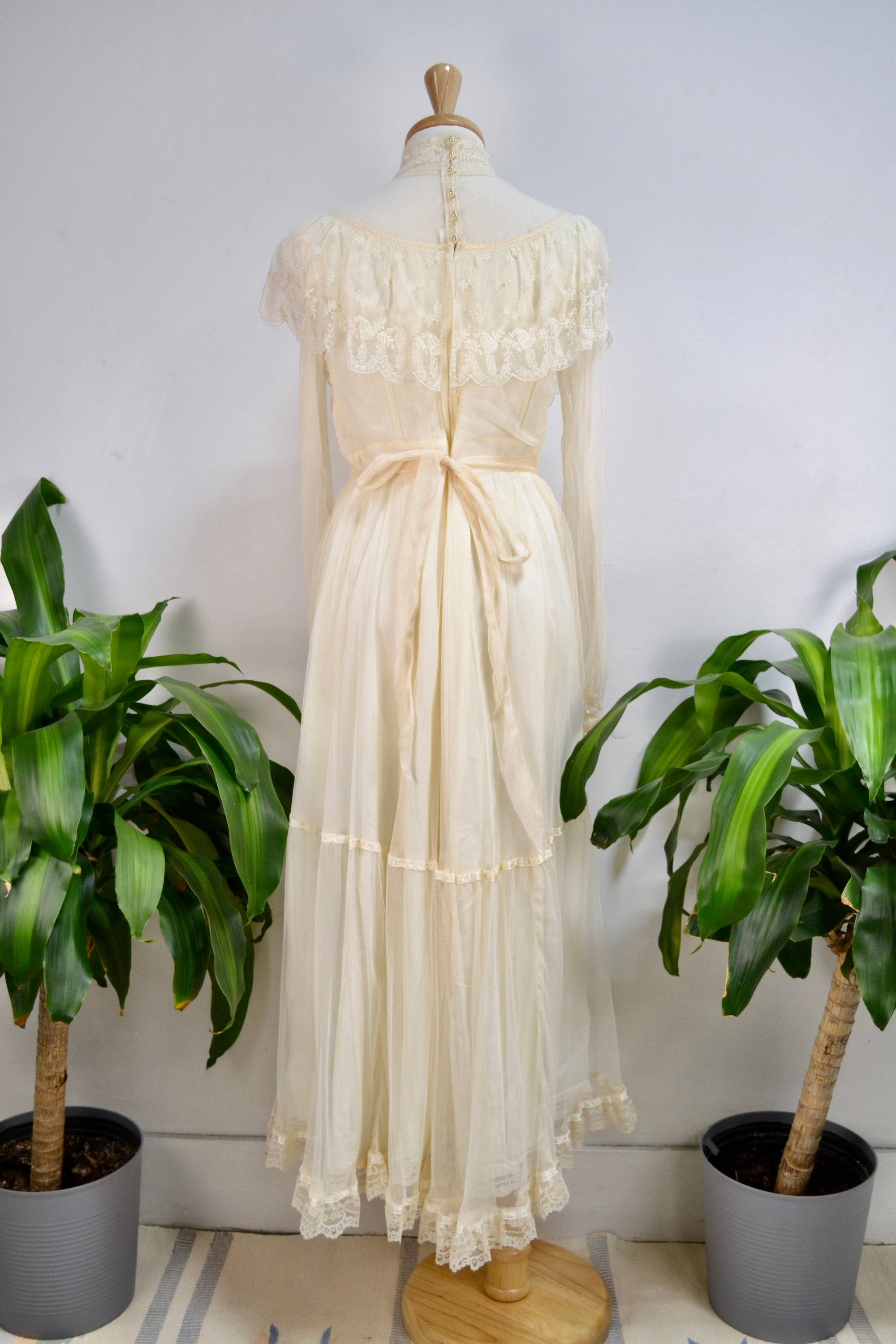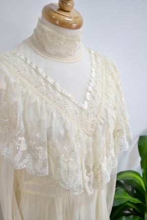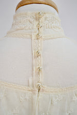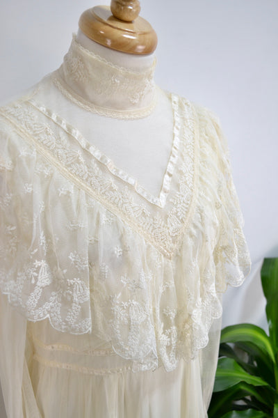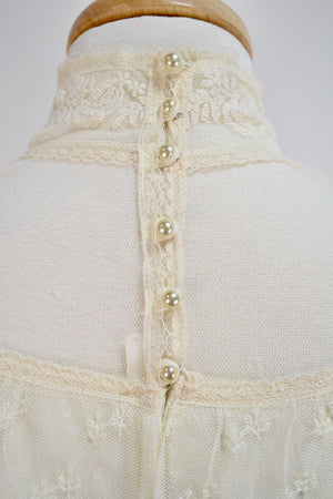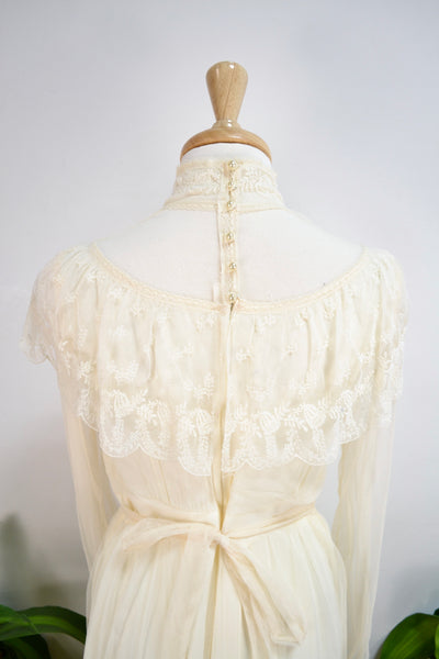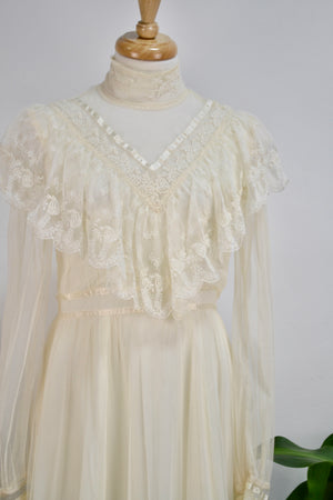 Vintage Seventies "Gunne Sax" White Lace Bridal/Prairie Dress. Sheer Puff Sleeves With Lace Button Up Cuffs. Mock Neck. Lined. Zipper and Button Closure in Back. Tie Waist.