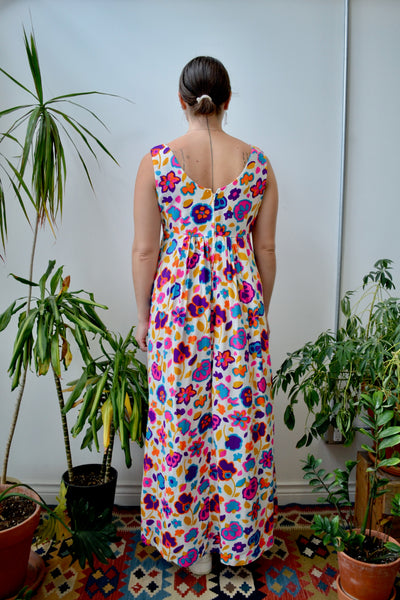 Vintage 1970s "Miss Hawaii" Bright Floral Maxi Dress. Empire Waist. Zipper Closure Up Back. Semi Sheer. Unlined.
