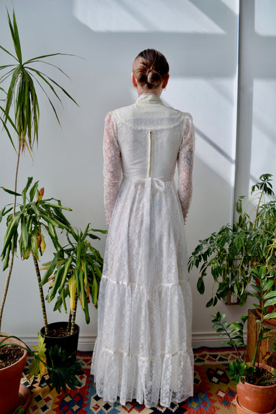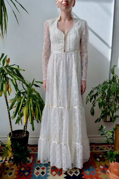 Seventies Gunne Sax "Romantic Renaissance Bridal Collection" Cream Lace Gown. Zipper Closure Up Back. Lace Up Bodice. Ribbon Trim. Fake Pearl Trim. Lace Overlay. Waist Tie. Lined.
