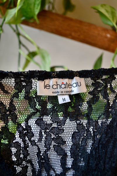 90s/00s Slinky Stretchy Le Chateau Black Sheer Lace Maxi Dress. Flutter Hem. Unlined. No Closure.
